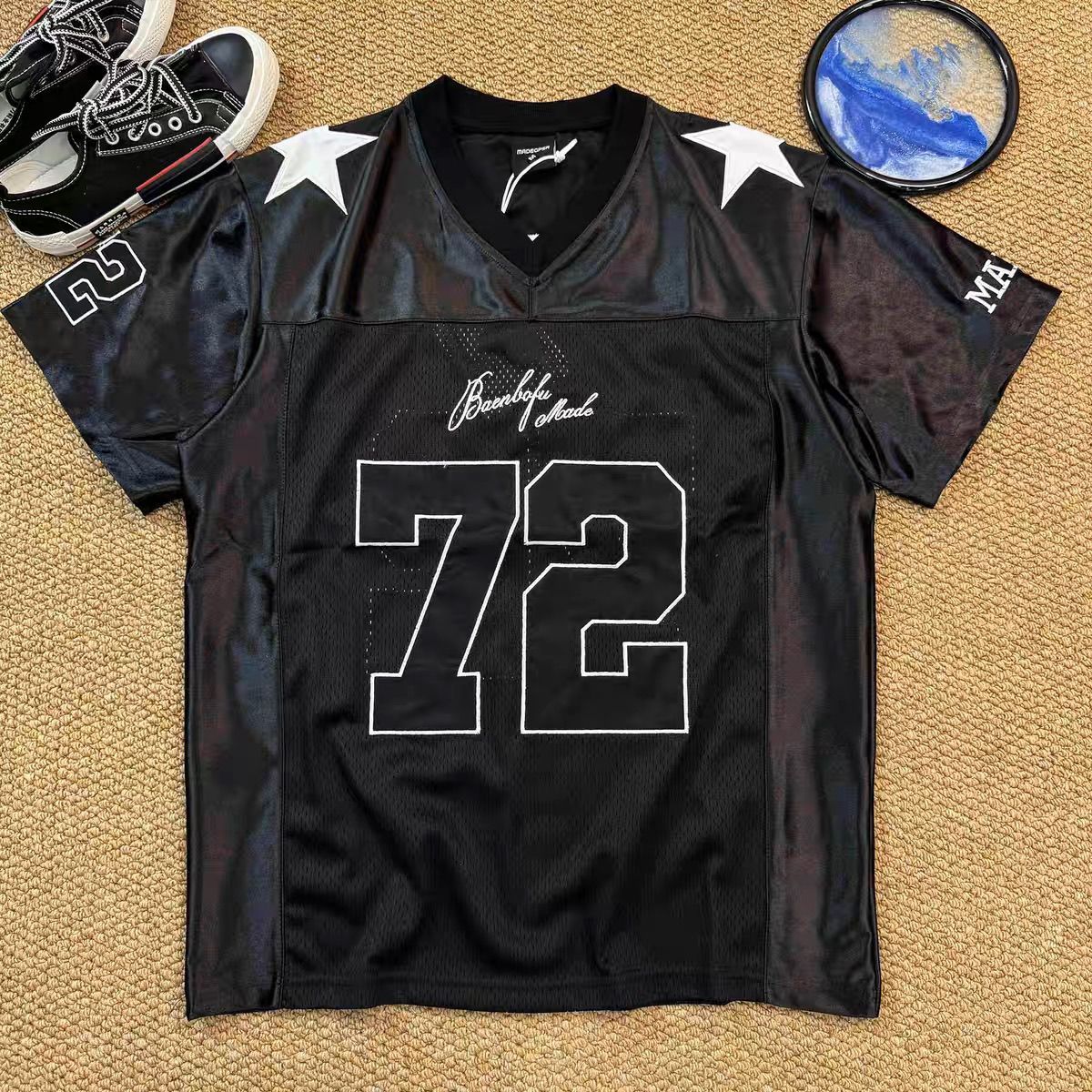 存在感のある「09」ナンバーが目を引く、スポーティーなフットボールTシャツ。肩や胸元、袖に施されたロゴワッペンや刺繍風プリントがアクセントとなり、ストリート感を演出。